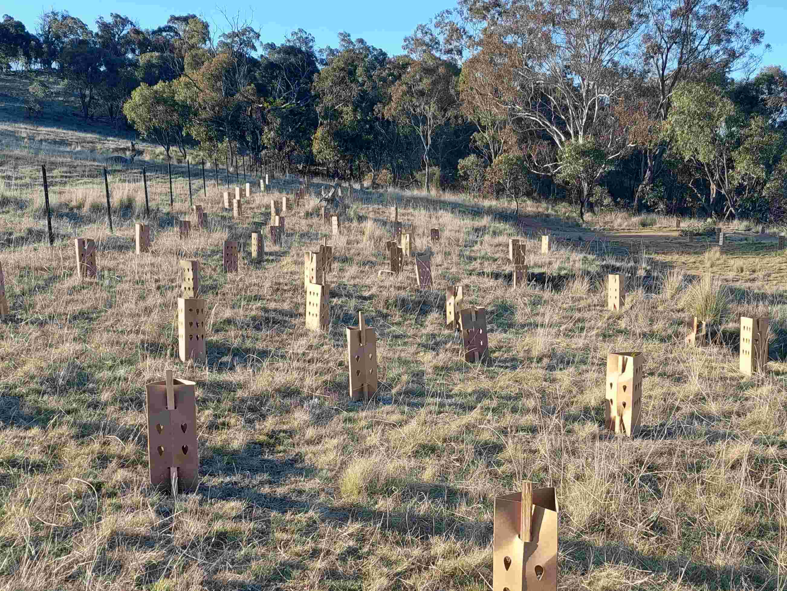 Landcare and Local Land Services supported a project at Stringybark Ridge, Burra Road, Michelago in 2022. This involved fencing off a large area of eroded land from livestock for 10 years to allow native grasses to re-establish. A mix of eucalypts, casuarinas and native shrubs were planted to supplement existing vegetation.